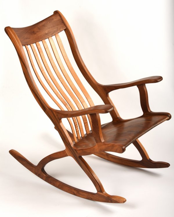 Robert Bragg Patented ergonomic walnut rocking chair Walnut and steam bent tiger maple hardwood At Mars Landing Galleries through September 28. Details HERE -- |